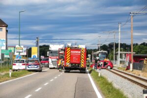 Ein herannahender Zug konnte im Bereich der davorliegenden Bahnhaltestelle stehen bleiben. Die Person wurde von der Feuerwehr aus dem Unfallwagen befreit und nach der Erstversorgung durch den Notarzt des Notarzthubschraubers Martin 3 mit dem Rettungswagen in ein Krankenhaus gebracht. Zusätzlich wurde die Drohne der Feuerwehr zur Unterstützung bei der Unfallaufnahme angefordert. Der Kreuzungsbereich war für etwa eineinhalb Stunden gesperrt.