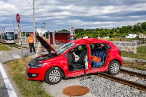 Der Unfall passierte Freitagfrüh auf der L1306 Vorchdorfer Straße, Gmundner Straße bei der Kreuzung mit der Bräuereistraße und Eggenberg im Gemeindegebiet von Vorchdorf. Aus noch unbekannter Ursache sowie ersten Informationen zufolge ereignete sich dort ein Unfall zwischen einem PKW und einem LKW. Der PKW kam danach auf den Bahngleisen zum Stillstand.