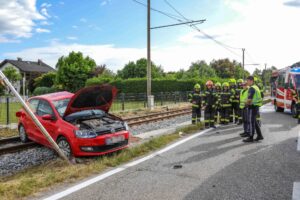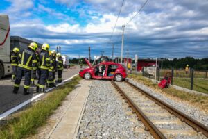 In Vorchdorf ist Freitagfrüh ein PKW nach einer Kollision mit einem LKW auf den Bahngleisen gelandet. Die Feuerwehr musste eine Person aus dem Unfallwagen befreien.