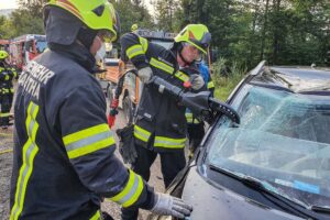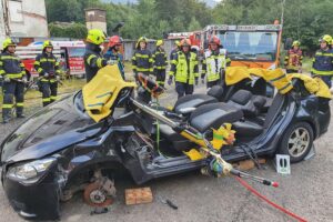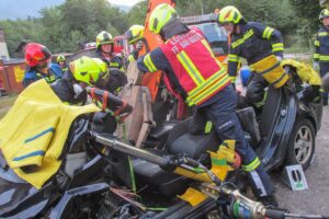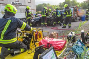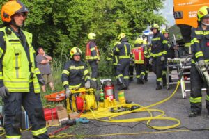 Gleich mehrere Fahrzeuge, darunter ein LKW, waren in das „Unfallgeschehen“ verwickelt, in einem PKW waren zwei Insassen eingeklemmt, aus einem leckgeschlagenen Fass lief brennbare Flüssigkeit aus – ausreichend Arbeit also für die Einsatzkräfte. Standardmäßig wurden von den beiden Feuerwehren die hydraulischen Rettungsgeräte mit dem nötigen Zusatzequipment zum Einsatz gebracht, um die beiden Eingeklemmten aus dem PKW zu befreien.