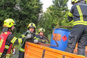 Parallel dazu mussten zudem zwei „verletzte“ Insassen aus der hohen LKW-Kabine unter Nutzung zweier Rettungs-Plattformen schonend zu Boden verbracht werden. Und auch die auslaufende Flüssigkeit konnte mittels Umfüllpumpe in ein Ersatzbehältnis umgepumpt werden. „In dieser Einsatzübung haben die beiden Feuerwehren Hand in Hand zusammengearbeitet, mit dem vorhandenen Ausbildungsstand funktionierte der Einsatz der Gerätschaften richtig gut“, konnte bei der gemeinsamen Übungs-Nachbesprechung resümiert werden.