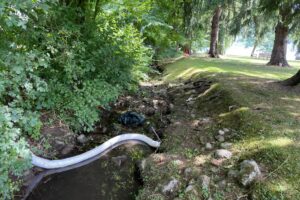 Aufgrund eines technischen Defekts trat das Öl über den Auffangbehälter hinaus und gelang durch ein Abwasserrohr in den Bach. Noch während der Ursachensuche wurde vorsorglich eine Ölsperre in den See verlegt. Für die Reinigungsarbeiten wurde eine Fachfirma aus Pinsdorf beauftragt. Der Einsatz dauerte am 14.7.2023 an die 9 Stunden, ging aber am 15.7. weiter, da immer noch etwas Öl in den Bach nachsickerte, so die Feuerwehr.