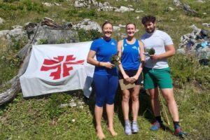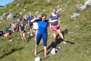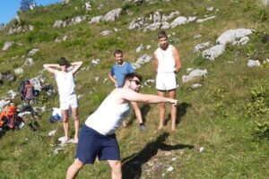 Am Morgen des 23. Juli begrüßten wir den Wettkampftag mit Liedern und Schwegelpfeifen, bevor wir uns in einer Damen- und einer Herrenriege beim schnellen Lauf über Stock und Stein, beim Standweitsprung und beim Steinstoß maßen.