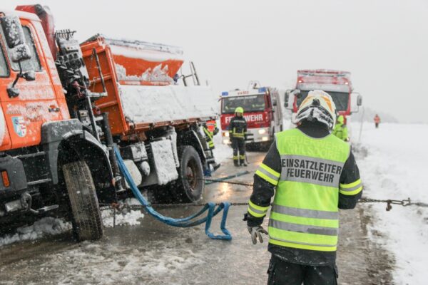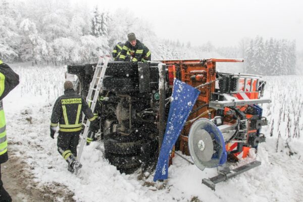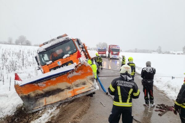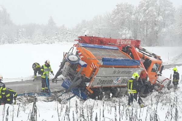 Kurz darauf, um 12:24 Uhr, erreichte die Feuerwehr die nächste Meldung: Ein LKW mit Schneepflug war in Aichlham umgestürzt. Der Fahrer blieb glücklicherweise unverletzt. In einer gemeinsamen Arbeitsakt mit der Feuerwehr Vöcklabruck und dem Einsatz eines Bergekrans wurde das Fahrzeug behutsam aus seiner misslichen Lage befreit. Die Unterstützung eines Landwirts mit einer starken Seilwinde trug wesentlich zum erfolgreichen Ergebnis bei.