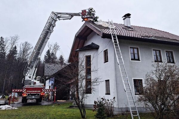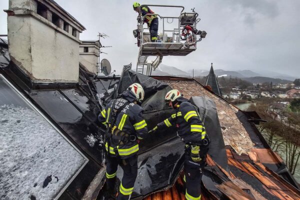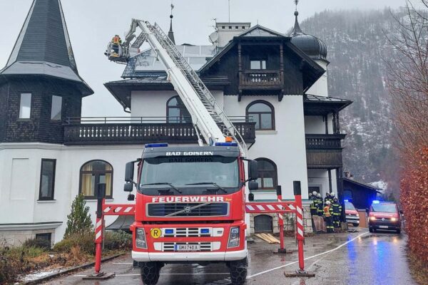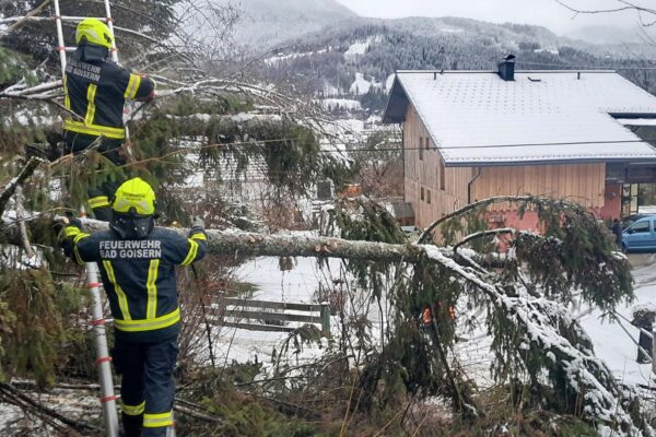 „War man schon in der vorherigen Nacht bis in die frühen Morgenstunden im Einsatz, langten mit Tagesanbruch schon wieder die nächsten Alarmierungen ein. Wiederum galt es zahlreiche Sturmschäden zu beseitigen. In die Nachbargemeinde Obertraun rückte unser Last mit Kran aus, während unsere Hubrettungsbühne bis in den Nachmittag an mehreren Schadensstellen in Bad Ischl unterstützend im Einsatz stand.