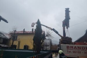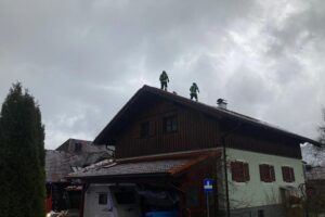 Die Kameraden der FF Bad Goisern unterstützten die Sicherungs- und Abdeckarbeiten mit der Teleskopmastbühne. Auch zwei Krane von privaten Firmen halfen bei den Arbeiten der Feuerwehr.