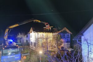Die neu angeschaffte Drohne erwies sich als sehr hilfreich. So wurden damit in der Nacht Dächer ausgeleuchtet und die Lageerkundung durchgeführt und das Schadensausmaß an den Dächern ermittelt.