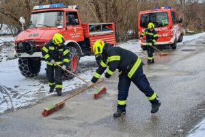 Noch während diese Bergearbeiten im Gange waren, langte der Alarm zu einer Ölspur ein. Zusätzliche Kräfte und Fahrzeuge machten sich daraufhin zum angegebenen Einsatzort auf den Weg. Auf einer Gemeindestraße musste eine 700 Meter lange Ölspur gebunden werden. Mit zig Säcken Ölbindemittel, Besen, Schaufeln und der Kehrmaschine des Feuerwehr-Laders konnte auch dieser Einsatz schließlich per 14:43 Uhr beendet werden.