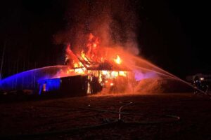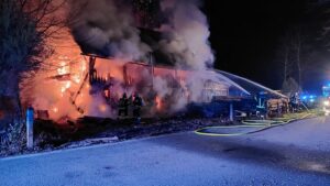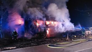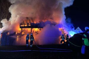 Bereits bei der Anfahrt in das Gerätehaus war der Feuerschein schon von weitem ersichtlich. Somit rückten die Kameraden mit einen Großaufgebot an Einsatzkräften zum bestätigten Gebäudebrand Richtung Ortschaft Steinbruch aus.