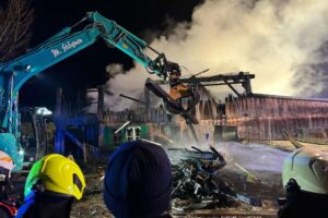 Nachdem die umfassenden Löschmaßnahmen Wirkung zeigten, konnte mit dem Suchen und Ablöschen von Glutnestern begonnen werden. Mit Hilfe eines in der Nähe abgestellten Baggers wurde das Dach und zum Absturz drohende Teile kontrolliert abgetragen und brennendes Material abgelöscht werden.