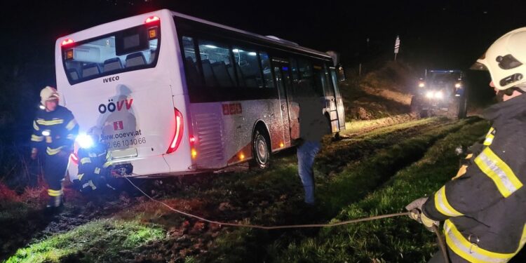 Zu einem kuriosen Einsatz wurden die Kameraden der FF Ottnang Montagabend alarmiert. Ein Bus des OÖVV, der als Schienenersatzverkehr eingesetzt wurde, blieb auf einem Feldweg stecken. Der Busfahrer verließ sich auf die Angaben seines Navigationssystems und missachtete das Verkehrsschild „Sackgasse“.