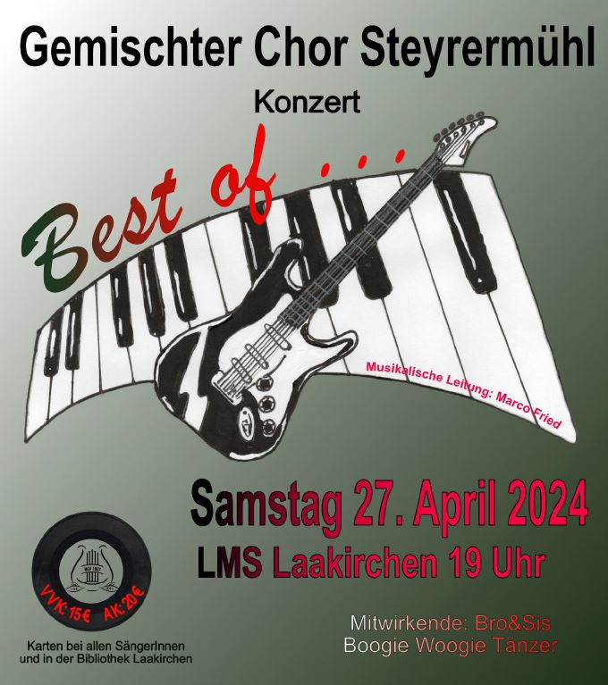 Der Chor Steyrermühl lädt am 27. April um 19:00 zum Konzert in der Musikschule Laakirchen. Auf dem Programm stehen Highlights der letzten 10 Konzerte unter unserem Chorleiter Marco Fried.