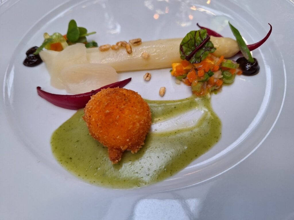 Das Publikum bestand überwiegend aus den Eltern und Familienangehörigen der jungen Gastronomen, aber auch aus Vertretern der OÖ. Bildungsdirektion und des öffentlichen Lebens – unter anderem Tourismusdirektor Jakob Reitinger oder WKO-Bezirkschef Robert Oberfrank. Das A-Team begeisterte die Gäste mit Stanglfischen vom Grill, einem gekühlten Erbsensüppchen mit Minze, einer Reinanke auf Leindotteröl-Spinat, gefolgt von mariniertem Spargel auf Kressecreme mit knusprigem Dotter.