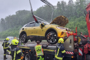 Ein schwerer Verkehrsunfall hat sich am Dienstag auf der A1 ereignet. Ein Elektroauto kam im Starkregen von der Fahrbahn ab und wurde in eine Böschung geschleudert. Die Feuerwehr musste das Fahrzeug mit dem Kran bergen, der Fahrer konnte sich selbst befreien.