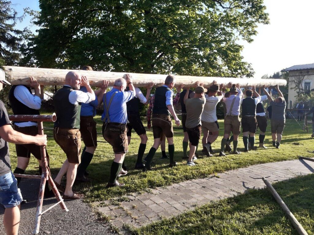 Bei prächtigen Frühlingswetter wurde unter der Anleitung von Gernot Gföllner der Maibaum mit Gabeln und Muskelkraft in Position gebracht und das Spruchtaferl befestigt.