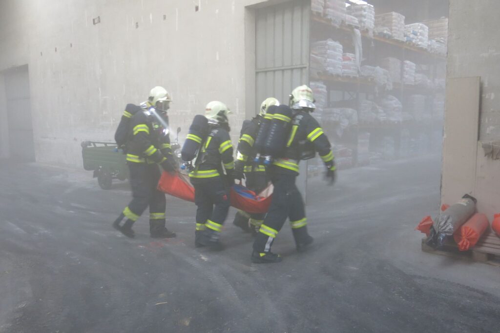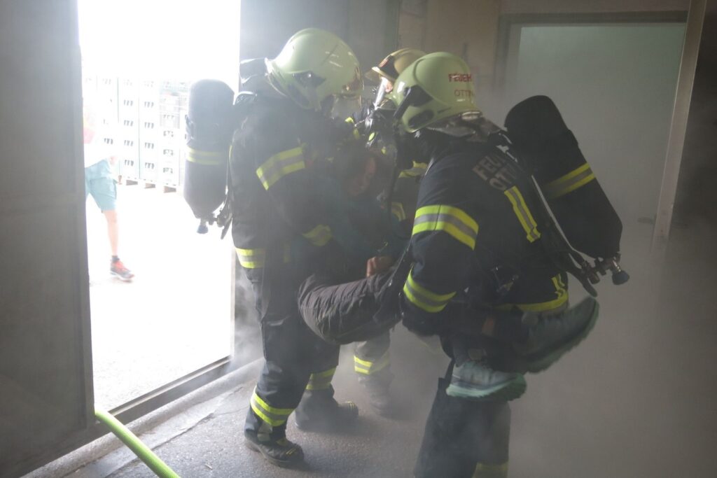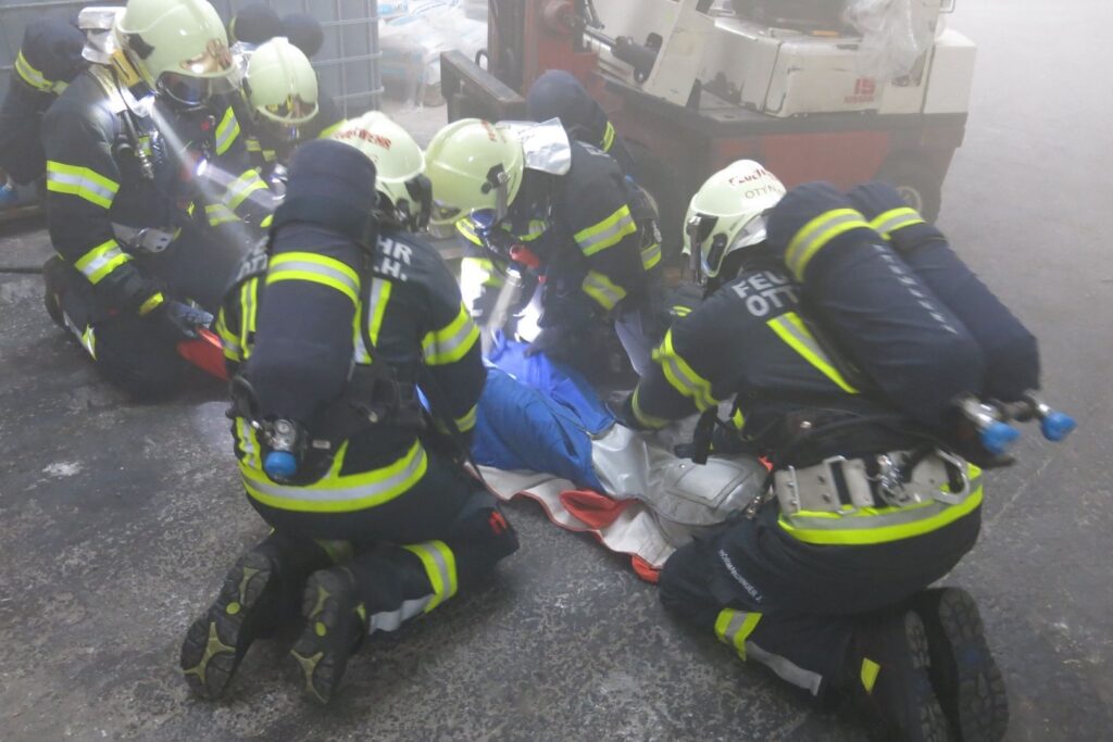 Eine herausfordernde Menschenrettung war vor allem eine Person, die unter dem Hubmasten eines Gabelstaplers eingeklemmt war. Ebenfalls wurde die Druckbelüftung mittels Hochleistungslüfter, ein Außenangriff mit B-Rohr und die Patientenbetreuung von den Kamerad:Innen durchgeführt.