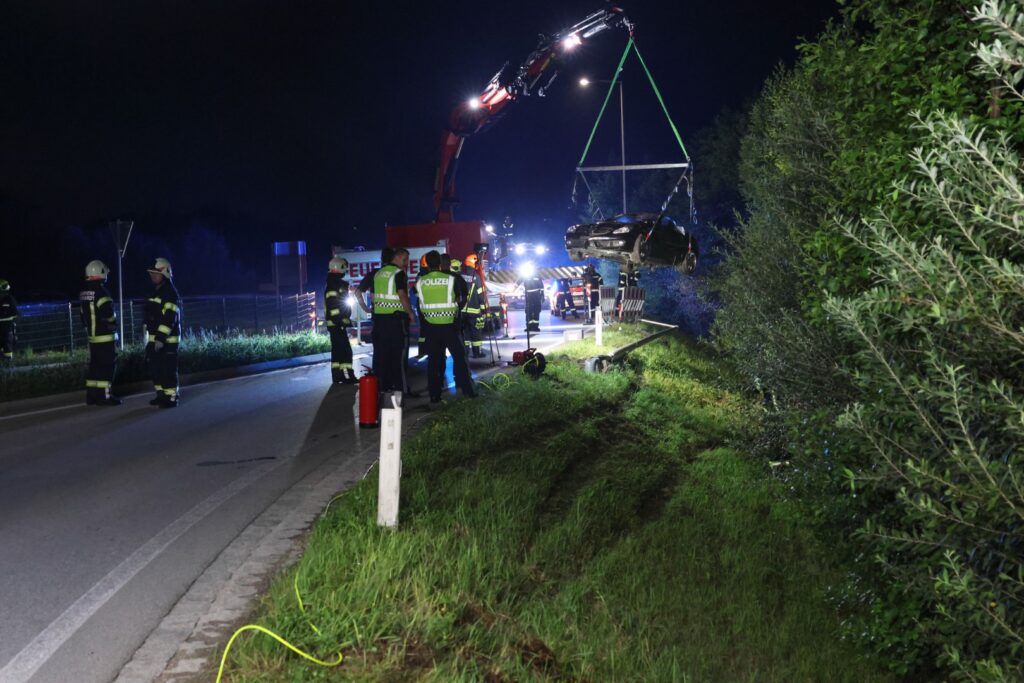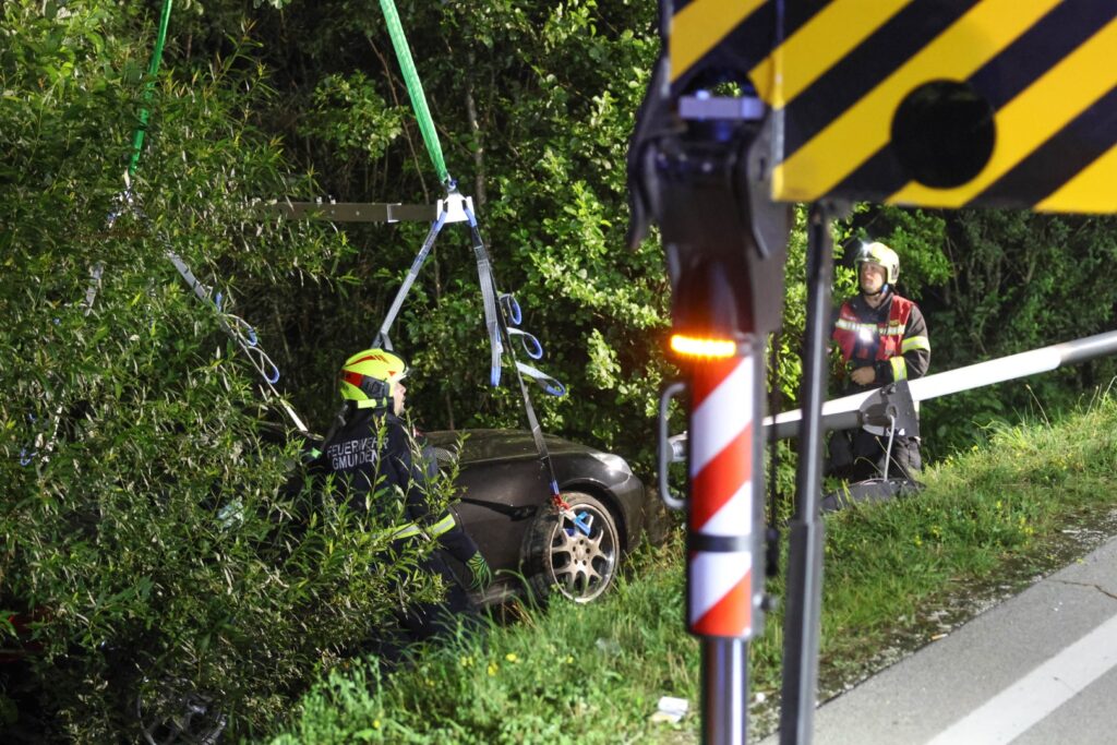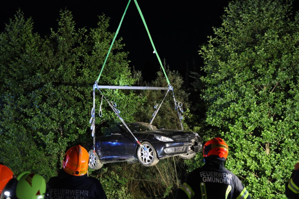 In Gschwandt ist am späteren Samstagabend ein Cabrio in einem Kreisverkehr von der Fahrbahn abgekommen, gegen eine Straßenlaterne gekracht in der Böschung gelandet.