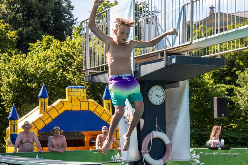 Am Wochenende feierte das Ischler Parkbad ein fulminantes Sommeropening, das zahlreiche Besucher anzog und für einen unvergesslichen Tag sorgte. Schon am Nachmittag begann das bunte Treiben mit einem spannenden Arschbomben-Wettbewerb. Mehr als 100 mutige Teilnehmer zeigten vor einer Jury, bestehend aus Mitgliedern der Naturfreunde und des Ischler Jugendrates, ihre besten Sprünge ins Wasser. Die Jury bewertete die Sprünge nach Kreativität und Spritzhöhe, und die Zuschauer feuerten die Teilnehmer begeistert an.
