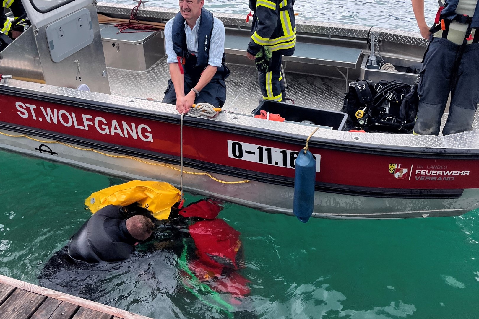 Ein Taucher der FF St. Wolfgang brachte Hebekissen vom A-Boot aus am Fahrzeug an. So konnte das Zweirad mit dem Kran schnell wieder an Land gebracht werden.