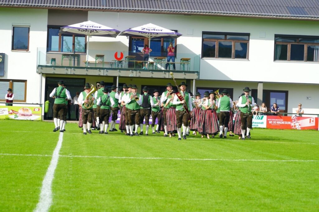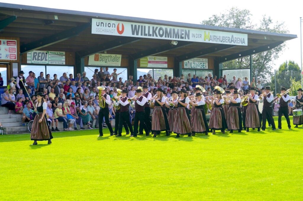 Was dann folgte war ein musikalisches Feuerwerk von 16 Musikvereinen, die im 10 Minuten Takt am Fußballplatz einmarschierten und ihre Darbietungen in den Stufen D, D+1, E und als Gastgruppen darboten. Einen derartigen Genuß für Ohren und Augen gab es wohl am Rasen in Gschwandt noch nie. Besonders hervorzuheben waren die Showvorführungen der Klangkörper Kirchham, Neukirchen, Lindach und Pinsdorf, denen mit tosendem Applaus gedankt wurde. Im abschließenden Festakt wurde von den Ehrengästen die Wichtigkeit des Zusammenhaltes, der kulturelle Wert der Musikkapellen und der Einsatz der vielen Musiker hervorgehoben. Mit Gänsehaut spielten dann alle Musikkapellen einige gemeinsame Musikstücke und als krönender Abschluss drei Strophen der Landeshymne „Hoamatland“. Nach diesen Strapazen des Tages hieß es für alle Musikerinnen, Musiker und Gäste ab in die Reithalle der Union Gschwandt zum gemütlichen Teil und zur wohlverdienten Jause, wo die Musikgruppe „Die Unbrassbaren“ den musikalischen Teil gestaltete. Und so kann es weiter gehen – Musik verbindet Menschen!