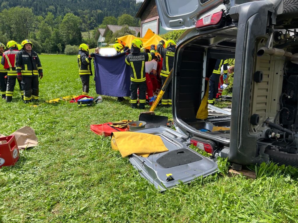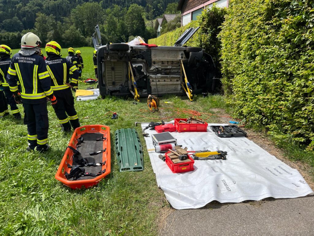 Kurz vor der Ortseinfahrt Oberwang im Bereich Gessenschwandt verunfallte ein Kastenwagen, kam von der Straße ab und prallte gegen eine Stützmauer. Das Fahrzeug lag auf der Fahrerseite. Der Lenker des Kastenwagens wurde schwer eingeklemmt. Einsatzleiter Robert Grabner von der Oberwanger Feuerwehr war mit seiner Mannschaft und den benachbarten Feuerwehren bei sengender Hitze stark gefordert, den Lenker zu befreien. „Wir mussten das Dach mit einer Säbelsäge entfernen, um mit weiteren Bergewerkzeugen den Lenker zu befreien. Diese Arbeit mit voller Einsatzausrüstung bei über 30 Grad Hitze verlangte meiner Mannschaft alles ab!“ berichtete Einsatzleiter Robert Grabner.
