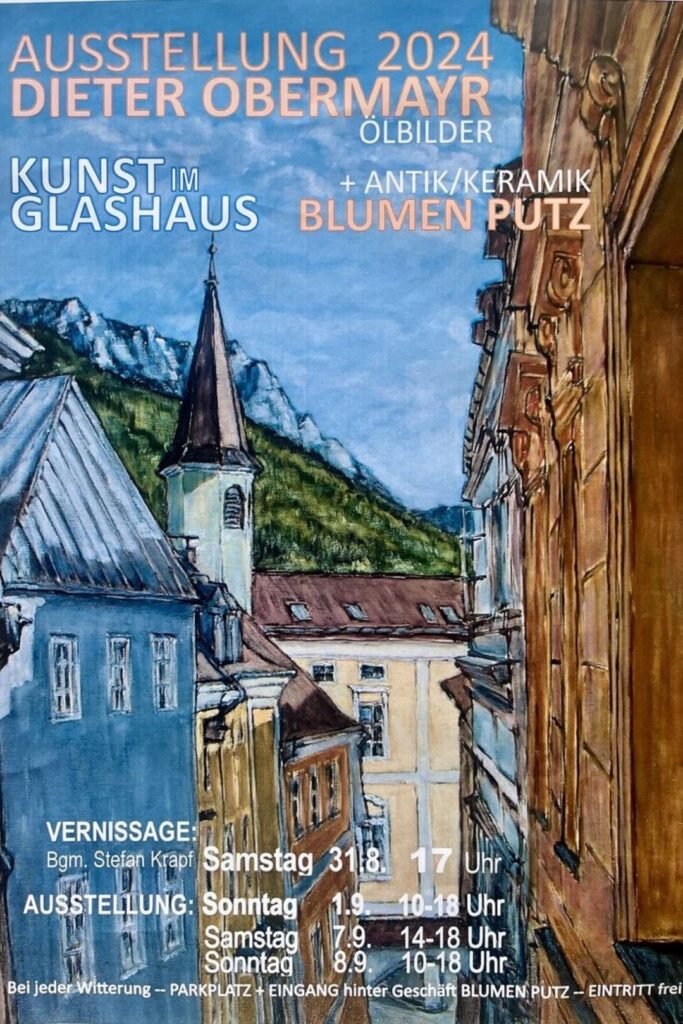 Nach 50 Ausstellung ist wohl der Zeitpunkt gekommen, meine aktive malerische Laufbahn zum Abschluss zu bringen. Dazu habe ich einen besonderen Ort für meine wohl letzte Ausstellung gefunden. Im Glashaus der Gärtnerei Putz in der Traunsteinstraße findet am Sonntag 1.9.2024 von 10-18 Uhr, am Samstag 7.9. von 14-18 Uhr und am Sonntag 8.9.2024 von 10-18 Uhr die Ausstellung KUNST im GLASHAUS mit 50 meiner Ölbilder statt. Dazu gibt es auch ANTIK/KERAMIK von Blumen Putz zu bestaunen. Die Vernissage wird am Samstag 31.8.2024 um 17:00 Uhr durch Bürgermeister Mag. Stefan Krapf feierlich eröffnet.