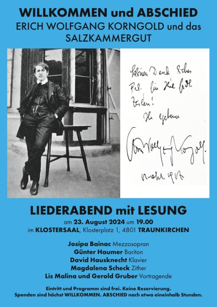 Das Konzert Willkommen und Abschied: Erich Wolfgang Korngold und das Salzkammergut (Mit Josipa Bainac, Mezzosopran, Günter Haumer, Bariton, David Hausknecht, Klavier, Magdalena Scheck, Zither, Lis Malina und Gerold Gruber, Lesung aus den Briefen) widmet sich speziell Korngolds Aufenthalten in Alt-Aussee, Gmunden (Villa Fernblick), Bad Ischl und Höselberg. 1932 erwarben Luzi und Erich Korngold das Schloss Höselberg in Gschwandt bei Gmunden und verbrachten dort jeden Sommer bis zum Jahr 1937. 1938 wurde das Schloss von der Gestapo beschlagnahmt und diente nach dem Krieg als Unterkunft für Displaced Persons. In Höselberg erinnern heute eine Gedenktafel an den Komponisten, in Gschwandt ist eine Straße nach ihm benannt. Initiator zu zweiterem war Gustl Viertbauer (Musikmanager u.a von der Mundartband Die SEER ), dessen Großvater gerade mal eine halbe Stunde zu gehen hatte, um Korngold auf der Zither vorzuspielen: Man berichtet von einem willkommenen Hochgenuss für den Komponisten.