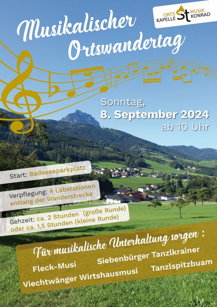 Am Sonntag, den 08. September 2024, lädt die OMK St. Konrad herzlich zum traditionellen Musikalischen Ortswandertag ein. Ab 10:00 Uhr treffen sich Musikliebhaber und Wanderfreunde beim Parkplatz des Badesees in St. Konrad, um gemeinsam die Schönheit der Natur zu genießen und sich musikalisch verwöhnen zu lassen.