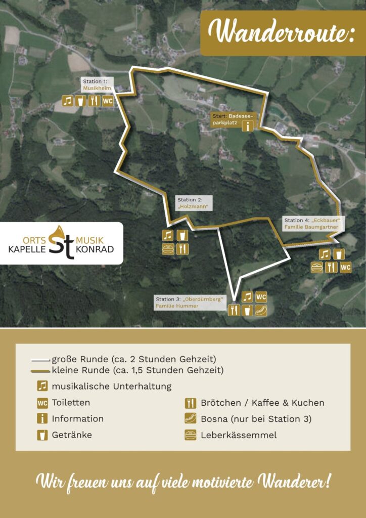 Die Wanderung führt durch die malerische Landschaft rund um St. Konrad, wobei an verschiedenen Stationen heimische Musikgruppen für musikalische Unterhaltung sorgen. Für das leibliche Wohl ist ebenfalls gesorgt – selbstgemachte Köstlichkeiten und erfrischende Getränke warten auf die Teilnehmer.