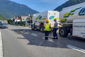 Glücklicherweise trat aus dem Tanklastfahrzeug keine beförderte Flüssigkeit aus. Nach der Unfallaufnahme durch die Polizei wurde die Unfallstelle schließlich seitens der Feuerwehr mittels Bergefahrzeug und Seilwinde wieder passierbar gemacht. berichtet die FF Bad Goisern.