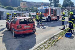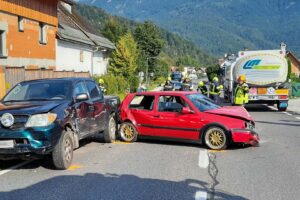 Zwei Autos waren auf der B 145 miteinander kollidiert, wobei ein Fahrzeug in weiterer Folge noch gegen einen entgegenkommenden Gefahrgut-LKW geprallt war. Teils schwer beschädigt kamen die Unfallfahrzeuge auf der Fahrbahn zum Stillstand, die Lenker blieben unverletzt.