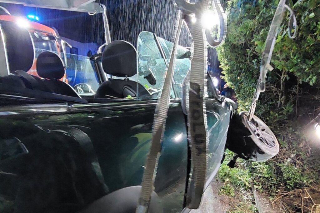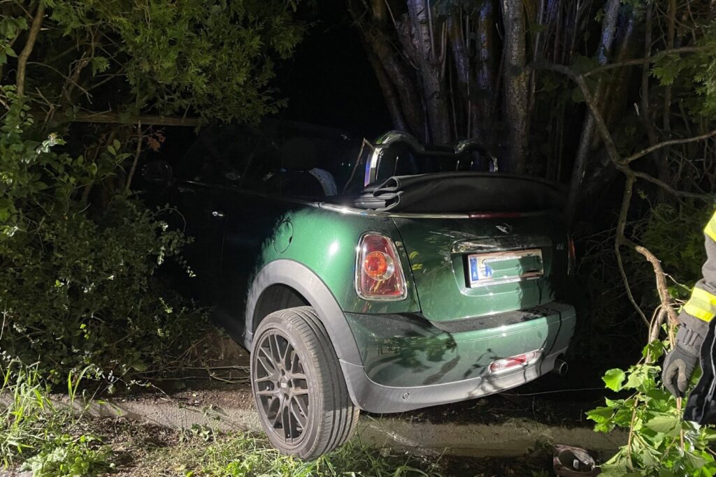 Noch spektakulärer war der zweite Unfall, der um 1:23 Uhr die Feuerwehrleute aus dem Schlaf riss. Mit dem Einsatzstichwort „PKW steckt in Hecke“ wurden die Florianis zum Einsatzort gerufen. Ein Mini Cabrio, das von der Bahnhofstraße kam und in die Marktstraße einbiegen wollte, verlor die Kontrolle. Das Fahrzeug touchierte eine Straßenlaterne, riss einen Hydranten aus der Verankerung und landete schließlich in einer Tujenhecke. Bei diesem Unfall rannte ein Hund vor Schreck davon und ist seitdem verschwunden.