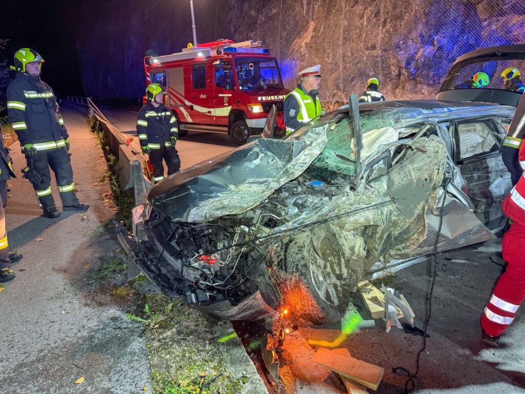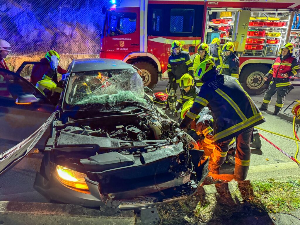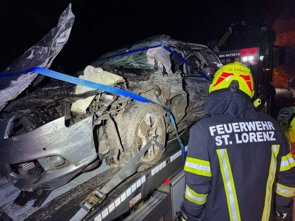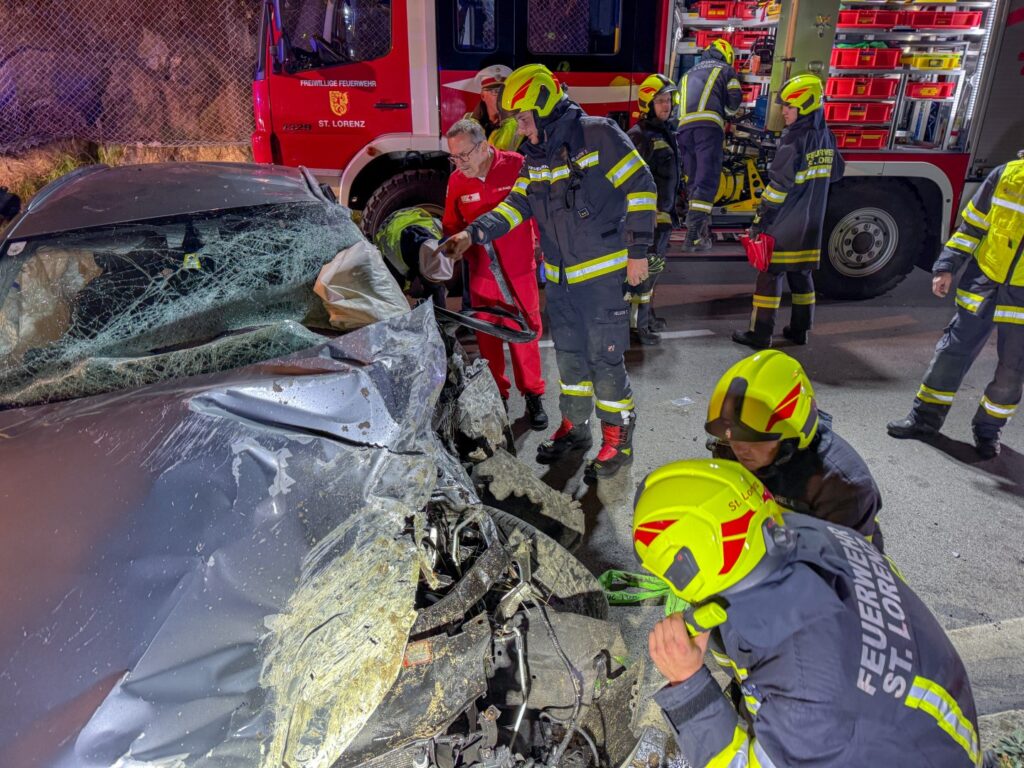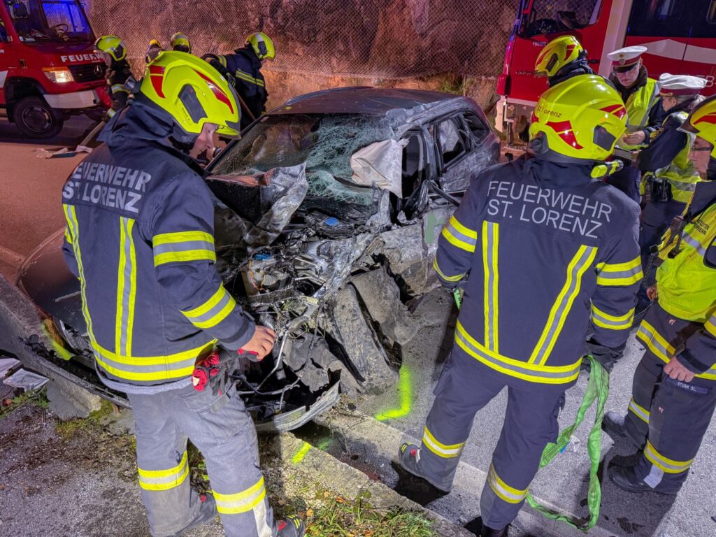 Durch die Wucht des Aufpralls wurde die linke Fahrzeugseite massiv deformiert. Das Fahrzeug kam auf der anderen Straßenseite bei den Betonleitschienen vor dem Seeufer zum Stehen. Der Einsatzleiter der Feuerwehr St. Lorenz Stefan Sturm schilderte die Lage beim Eintreffen: „Im stark verformten Unfallfahrzeug war der Lenker eingeklemmt, die anderen drei Insassen, konnten das Fahrzeug zwar verletzt, aber selbständig verlassen!“