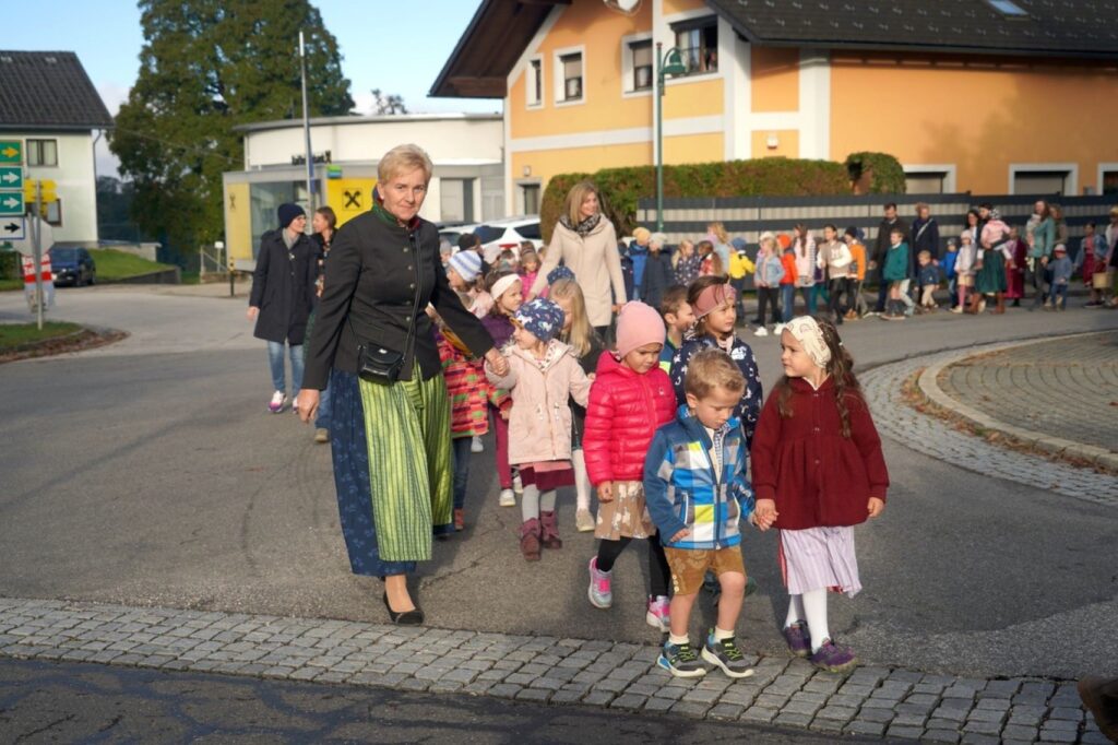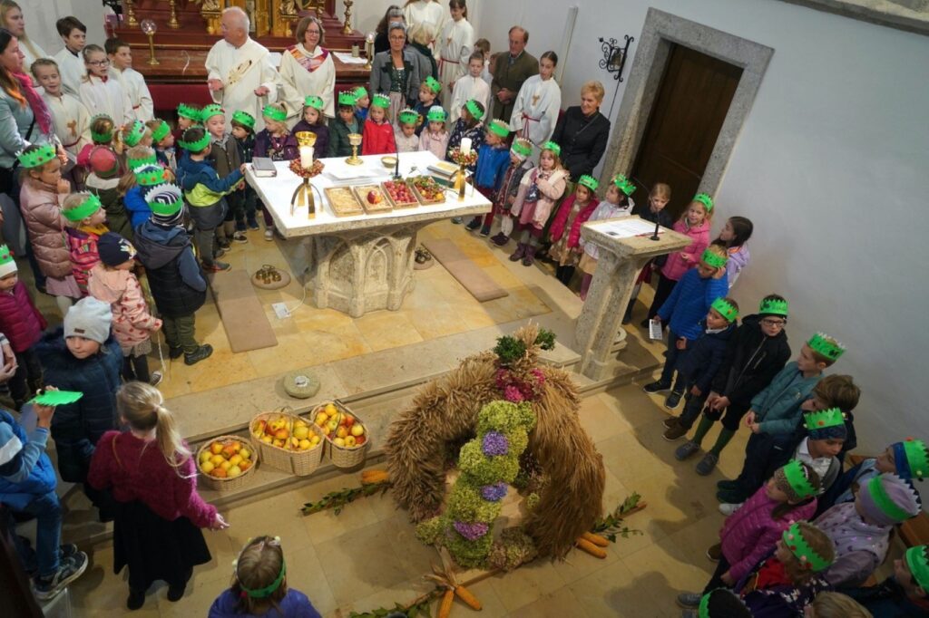 Beim gemeinsamen „Vater unser“ wurden alle Kinder rund um den Altar aufgestellt, man reichte sich im gesamten Kirchenraum die Hände und zeigte so, dass nur ein Miteinander im Leben zählt und so ein erfülltes Leben zustande kommt. Eine Überraschung hatte auch der anwesende Bürgermeister von Gschwandt Fritz Steindl für Anna-Maria Marschner! Er überreichte aus der Spendensammlung bei seinem 60er Fest eine beachtliche Summe für den Neubau des Pfarrzentrums im geplanten Gemeindezentrum. Nach der Messfeier bekamen alle Kinder einen goldgelben Apfel mit „roten Wangerl“ und für die Pfarrbevölkerung hatten die Bäuerinnen eine Agape mit Köstlichkeiten aus der reichlichen Ernte des Jahres vorbereitet. Ein schöner Tag im Jahresablauf!