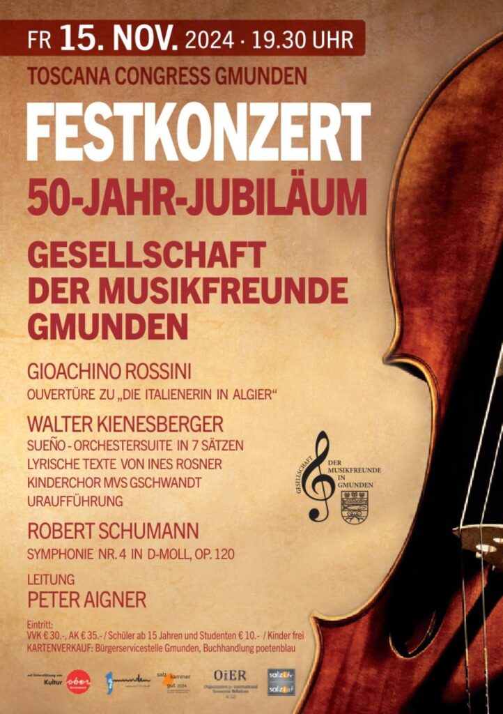 Die Gesellschaft der Musikfreunde in Gmunden (Leitung: Peter Aigner) begeht ihr 50-jähriges Bestandsjubiläum mit einem Festkonzert im Toscana Congress:
