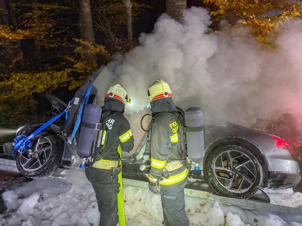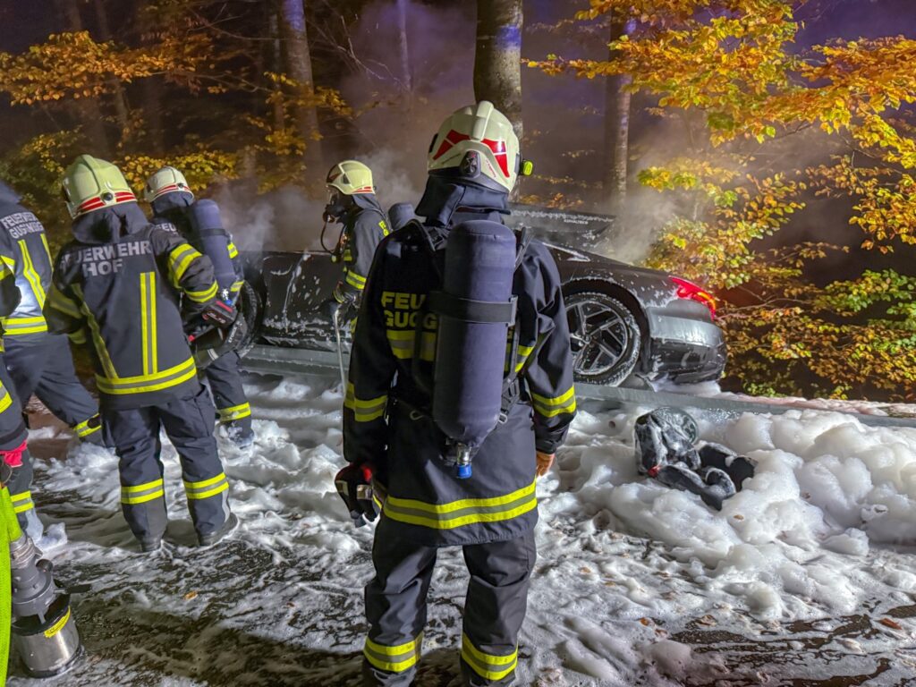 In der Nacht auf Freitag wurden die Feuerwehren Tiefgraben, Guggenberg und Hof bei Mondsee zu einem Brand eines Elektroautos auf die Mondseebergstraße alarmiert.