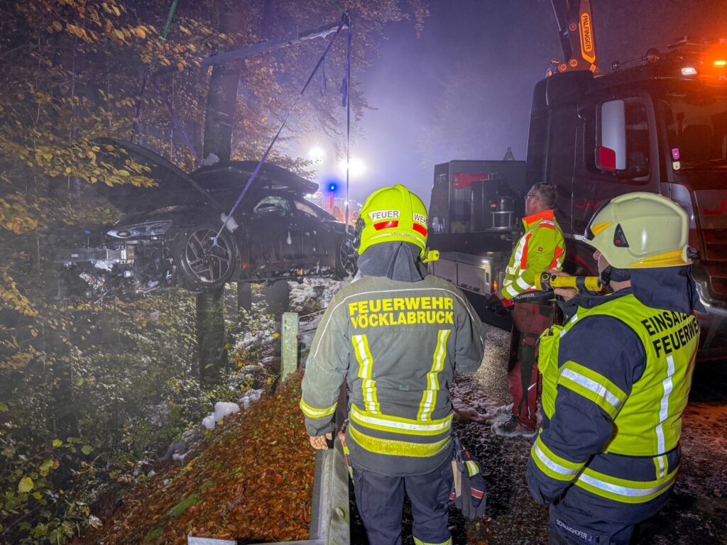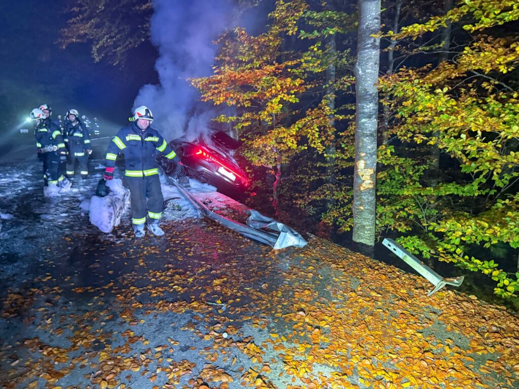 Bei der Ankunft der ersten Einsatzkräfte waren keine Personen mehr im Fahrzeug. Durch die Wucht des Aufpralls wurde die Leitschiene an mehreren Stellen aus der Verankerung gerissen und das Fahrzeuge in die Bäume des Hanges katapultiert. Zwei große Bäume verhinderten einen Absturz des E-Autos. Beim Unfall wurde niemand verletzt.