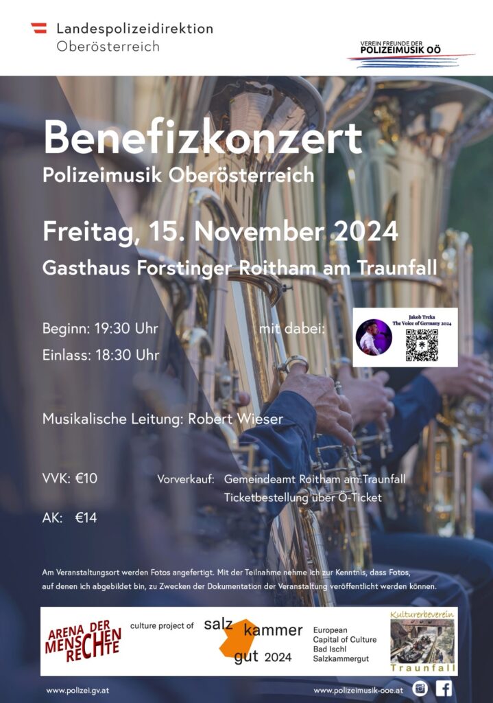 Am 15.11.24 findet das Benefizkonzert mit der Polizeimusik OÖ im GH Forstinger in Roitham am Traunfall statt. Der erfolgreiche Teilnehmer bei „The Voice of Germany“ Jakob Tricka ist mit dabei.