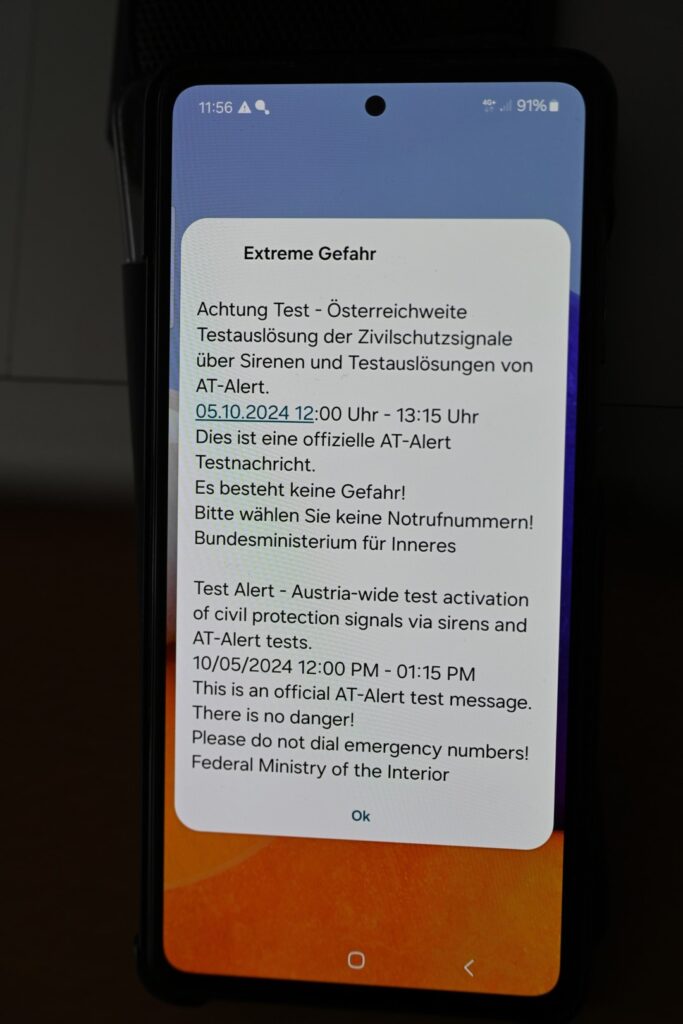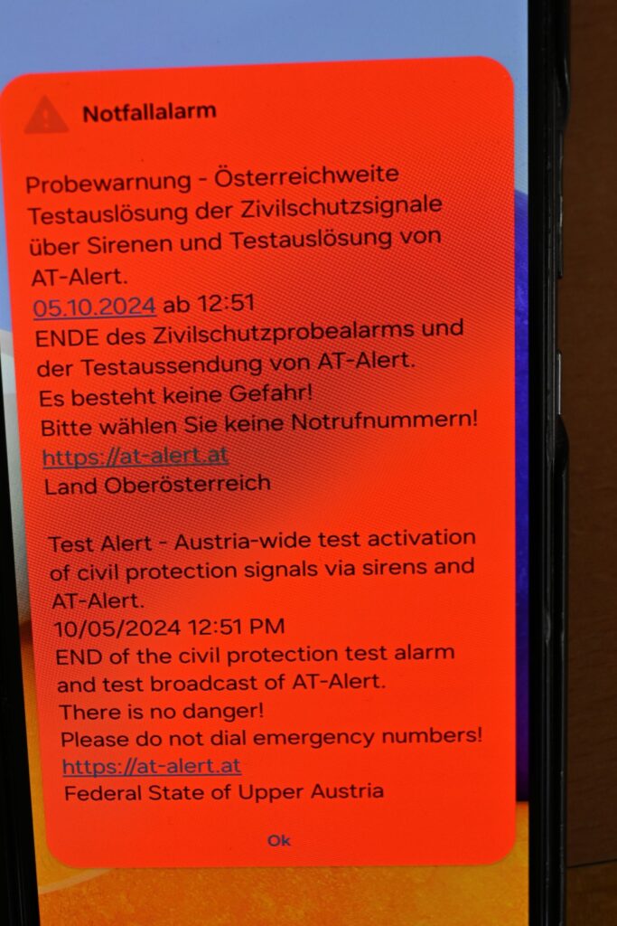 Am heutigen 5. Oktober 2024 fand in ganz Österreich der jährliche Zivilschutz-Probealarm statt. Zwischen 12 und 13 Uhr wurden die Warnsignale „Warnung“, „Alarm“ und „Entwarnung“ ausgesendet.