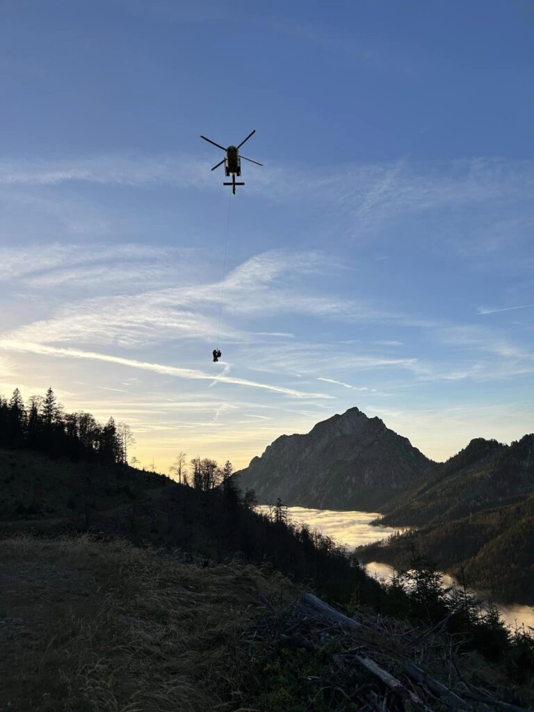 „Die Hubschrauberrettung gestaltete sich anfangs schwierig, da die Nebelgrenze auf knapp 1000m war und somit beinahe alle unsere Zwischenlandeplätze vom Nebel bedeckt waren. Bergretter unserer Ortsstelle, die sich zufällig am Traunstein befanden, stiegen sofort zum Einsatzort ab. Am Ende des Lainautales, nächst dem „Durchgang“ beim Zwillingskogel, konnten wir schließlich einen Zwischenlandeplatz einrichten und der alarmierte Notarzthubschrauber „Christophorus 14“ aus Niederöblarn konnte die Frau mit einem Tau retten und ins Krankenhaus Bad Ischl fliegen“, berichtet die Bergrettung.
