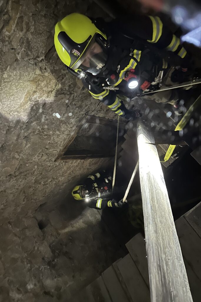 Bei der nachfolgend Übungsnachbesprechung in großer Runde wurde das geschehen besprochen und Verbesserungsvorschläge ausgetauscht. Es hatte hier auch jeder nochmal die Möglichkeit, die Gegebenheiten im Dachstuhl und Turm zu besichtigen.