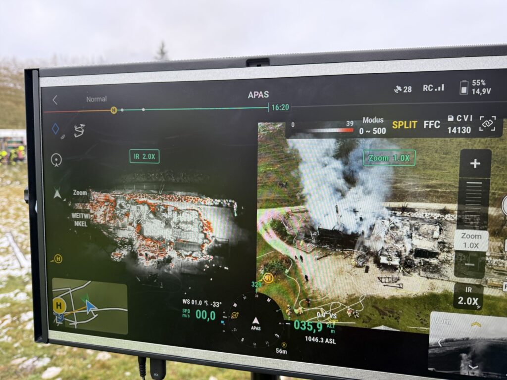 Eine Drohne der Feuerwehrdrohnengruppe des Abschnitts Mondsee unterstütze mit dem Wärmebild und Temperaturmessungen beim Auffinden der Glutnester im Rahmen der Nachlöscharbeiten.