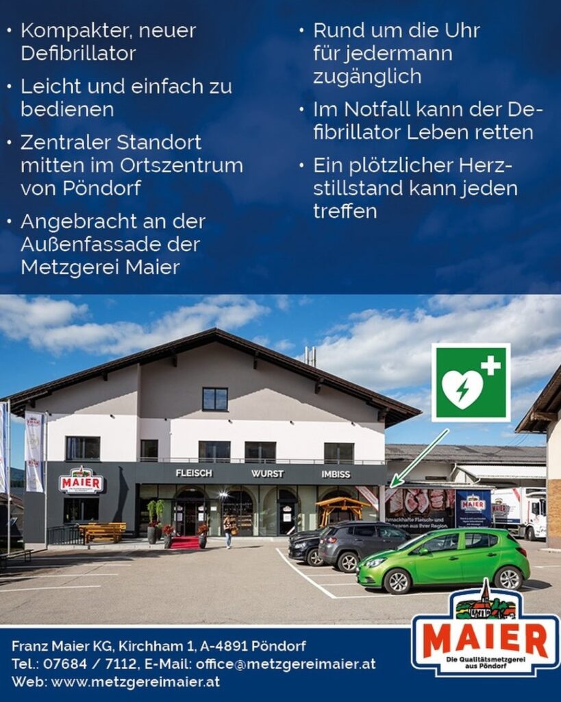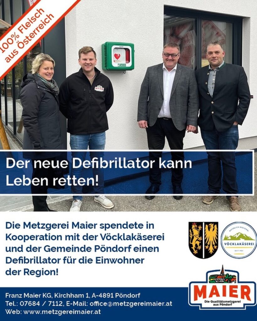 Die Metzgerei Maier spendete in Kooperation mit der Vöcklakäserei und der Gemeinde Pöndorf einen Defibrillator für die Einwohner der Region.