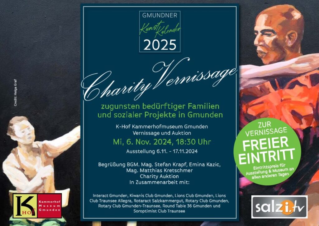 Das jährliche Highlight ist die Charity Vernissage im K-Hof Kammerhofmuseum Gmunden mit anschließender Ausstellung. Die in den beiden Kalendern ausgestellten Werke werden von 6. bis 17. November ausgestellt, am Vernissagenabend am 6. November 2024 werden das Werk „Red Velvet“ der Künstlerin Maike Pichler und, in Memoriam, das Werk „Buthan“ von Helga Graf versteigert. Die Vernissage beginnt um 18:30 Uhr, eröffnet durch Gmundens Bürgermeister Mag. Stefan Krapf, die Leiterin des Sozialamtes Emina Kazic und den Obmann des Gmundner Kunstvereins, Mag. Matthias Kretschmer. Der Eintritt ins Museum ist am Vernissagenabend frei, an den übrigen Tagen der Ausstellung gelten die regulären Eintrittspreis, welche alle Ausstellungen des Museums beinhaltet.