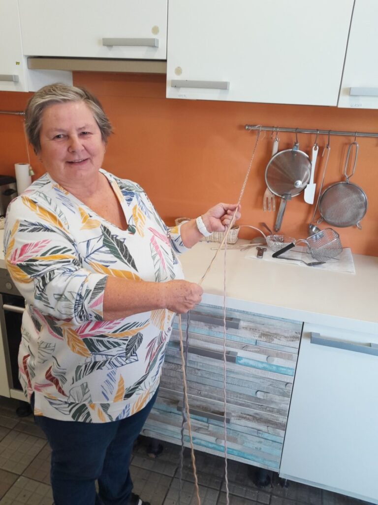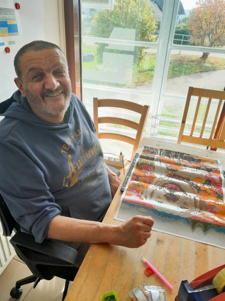 In den Werkstätten werden unterschiedliche Materialien wie Holz, Ton, Papier, Pailletten und Wolle verarbeitet. „Ich freue mich besonders, meine Paillettenbilder auszustellen. Die sind mit viel Arbeit und Geduld verbunden“, erzählt ein invita-Bewohner voller Stolz. Neben Deko-Objekten, Töpferware und Schmuck finden sich auf dem Markt auch Upcycling-Kunstwerke, kreative Näharbeiten, handgeschriebene Weihnachtsgrüße und eine Auswahl an selbstgebackenen Keksen. Die Adventkränze entstanden bei einer gemeinsamen Bastelaktion, an der Familienmitglieder, Freund*innen, Ehrenamtliche und pensionierte Mitarbeiter*innen beteiligt waren. Der Rohstoff für diese Kränze – frisches Reisig – wurde großzügig von Familie Rabanser aus Berg im Attergau gespendet.