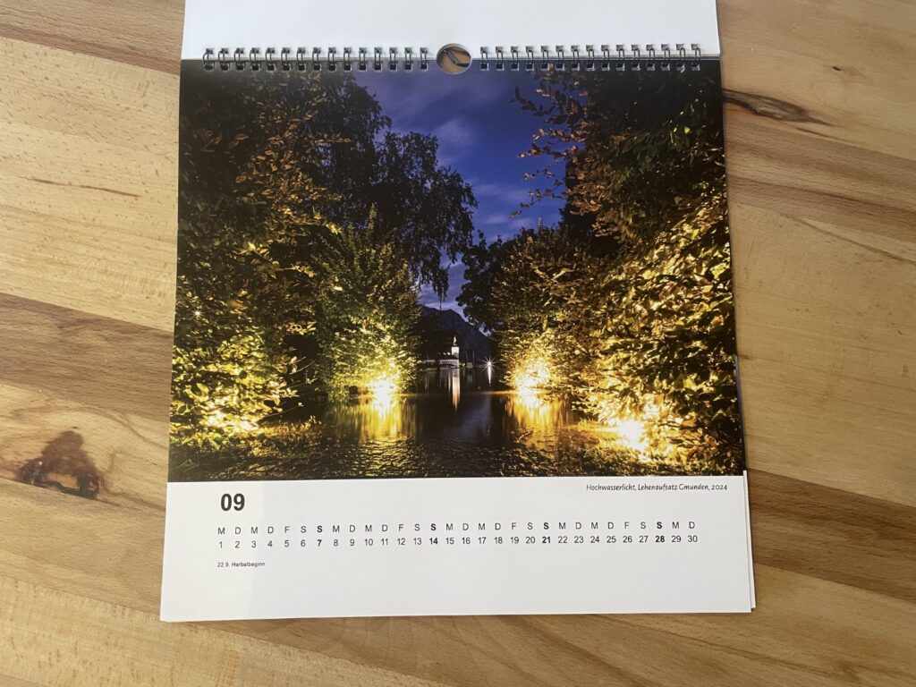 Mit dabei: Ein Foto von Komet Tsuchinshan-ATLAS, der heuer im Oktober 2024 in unserer Gegend zu sehen war, aber auch ein Bild vom Schloss Ort mit dem Titel „Hochwasserlicht“, das kurz nach den verheerenden Regenfällen im September 2024 aufgenommen wurde. Der Kalender ist also nicht nur schön anzusehen, sondern birgt mit so manchem Bild auch einen Rückblick auf das vergangene Jahr.