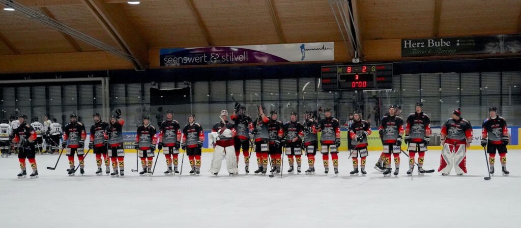 Die Gastmannschaft war nun darauf aus, den Spielstand möglichst zu halten und verteidigten auf Teufel komm heraus. Dies gelang auch bis knapp zur letzten Spielminute. Da fixierte Mathias Haiböck in Minute 58:50 nach Zuspiel von Fabian Richter und Paul Ornetzeder den Endstand von 8:2 Tore für die Gmundner Haie. Mit Standing Ovationen verabschiedeten die Eishockeyfans ihr Mannschaft in die Kabine. Die Tabellenführung der Sharks konnte nun auf 19 Punkte ausgebaut werden, gefolgt vom WEV/Wien mit 15 Punkte (die haben mit 4:0 gegen den ATSE Graz gewonnen), 3. in der Tabelle der KSV/Kapfenberg mit 12 Punkte, 4. Rang HDK Maribor mit 8 Punkte und Schlusslicht ATSE Graz mit 3 Punkte.