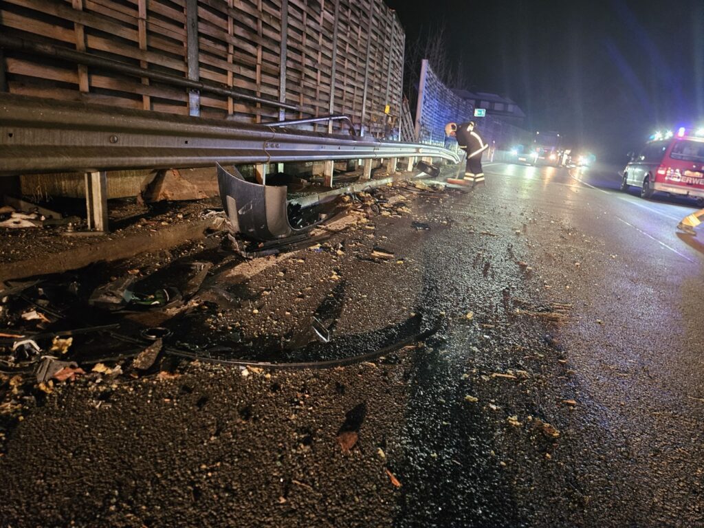 Ein Lenker geriet mit seinem PKW auf der B145 in einer Kurve auf die Leitplanke und darauffolgend gegen die Lärmschutzwand. Nachdem das Fahrzeug nach ca. 200 Metern schwer beschädigt auf der gegenüberliegenden Straßenseite zum Stillstand kam, glich die Fahrbahn einem Trümmerfeld. Metallteile steckten in der Lärmschutzwand und ein Element der Wand wurde förmlich aus der Verankerung gerissen. Wie durch ein Wunder blieb der Fahrer bei dem schweren Crash nahezu unverletzt.