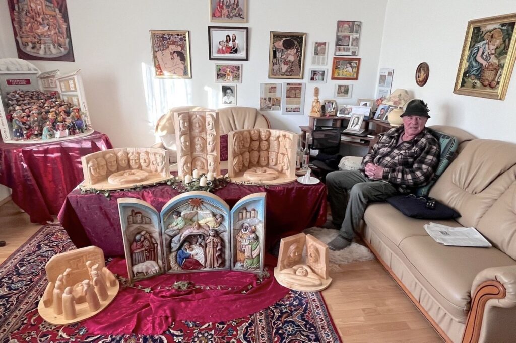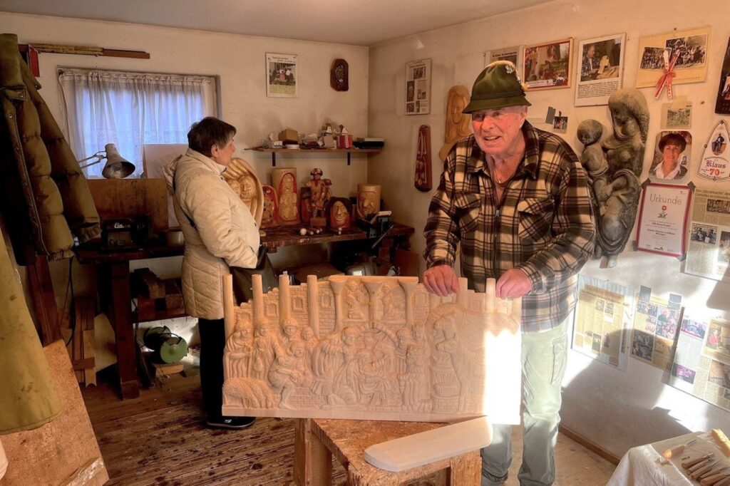 Nächste Station war bei Klaus Müllegger in Rindbach bei seinen herrlichen Blockkrippen. Klaus ist ein spätberufener Schnitzer, der erst mit 52 Jahre die Schnitzkunst erlernte und seither ausübt. Seine Spezialität ist das Schnitzen in Blockform. Ca. 10 cm dicke Lindenblöcke werden mit der Kettensäge grob bearbeitet und dann mit dem Schnitzmesser fein ausgearbeitet. Die fertigen Blöcke bekommen dann von einer bekannten Malerin ihre farbliche Gestaltung und werden aneinander gereiht. Deshalb der Name Blockkrippen. Aber auch sonst gibt es verschiedene Kunstwerke wie Statuen und eine Darstellung des berühmten Ebenseer Fetzenzuges. Unwahrscheinlich was Klaus Müllegger da in seinen mehr als 30 Jahren Schnitzertätigkeit geschaffen hat. Mit einem herzlichen Dankeschön für seine ausführlichen Erklärungen ging die Roas weiter.