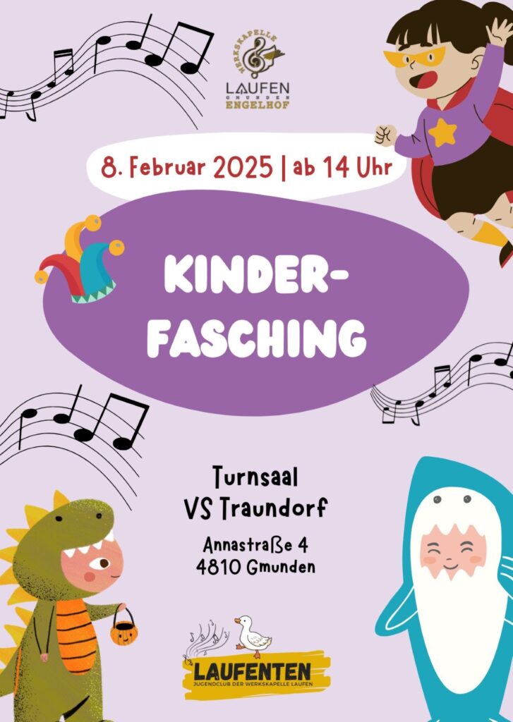 GMUNDEN. Das Jugendprogramm der Werkskapelle Laufen Gmunden-Engelhof, der Laufentenclub, lädt nach der erfolgreichen Premiere im Vorjahr auch heuer wieder zum öffentlichen Kinderfasching ein. Dieses Mal findet der musikalische Kinderfasching am Samstag, 8. Februar 2025, ab 14:00 Uhr im Turnsaal der Volksschule Traundorf statt. Auf die Kinder warten verschiedene Spielstationen mit Sammelpass und ein Puppentheater mit Maskottchen, Laufente Lotti. Verkleidungen sind selbstverständlich erwünscht und für Verpflegung ist gesorgt. Im Turnsaal der VS Traundorf sind keine Straßenschuhe erwünscht, daher bei Bedarf bitte Hausschuhe oder dicke Socken mitbringen. Eintritt: Freiwillige Spende für die Jugendarbeit.